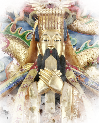 玉皇上帝,全稱「玉皇大天尊玄穹高上帝」,簡稱「玉皇」或「玉帝」,俗稱「天公」。祂是道教天界的最高統治者,地位崇高,掌管天地萬神,主宰天界政務與人間福祉。 作為天界實際的領導者,玉皇大帝象徵天地正道與最高的神聖權威,負責維持宇宙秩序和天人感應。民間信眾尊稱祂為「天公」,在每年農曆正月初九舉行隆重的祭祀典禮,祈求風調雨順、國泰民安。 玉皇大帝慈悲威嚴並存,祂的威德被視為天地間最高的法則與秩序象徵,是道教信仰核心與民間信仰的重要神祇。